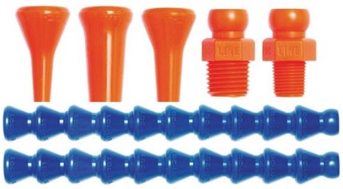 Basisset, bestaande uit 2 slangelementen à 140 mm, aansluitstukken NPT 1/2" en NPT 3/8" alsmede ronde spuitmonden 6 - 9 - 12 mm.