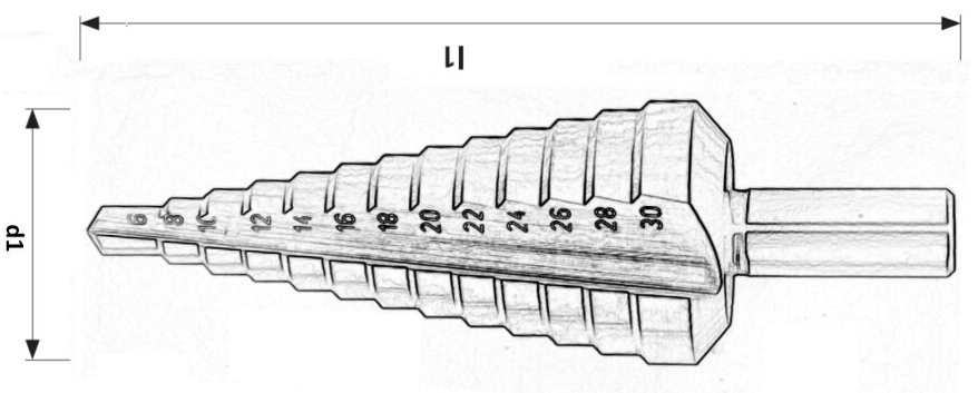 HSS trappenboren met een rechte spaangroef en 2 snijkanten. Verder beschikken de trappenboren over een kruisaanslijping en een cylindrische schacht met 3 meeneemvlakjes.