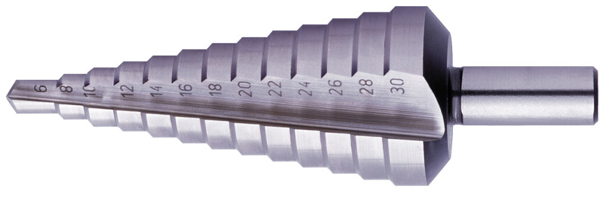 HSS trappenboren met een rechte spaangroef en 2 snijkanten. Verder beschikken de trappenboren over een kruisaanslijping en een cylindrische schacht met 3 meeneemvlakjes.