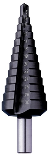 HSS trappenboren met een rechte spaangroef en 2 snijkanten. Verder beschikken de trappenboren over een kruisaanslijping en een cylindrische schacht met 3 meeneemvlakjes. TiALN coating.