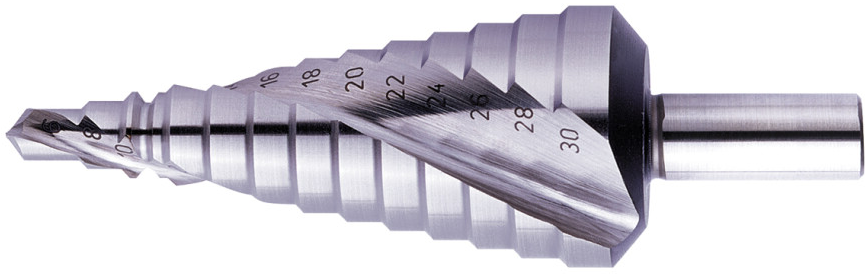 HSS trappenboren met een gespiraliseerde spaangroef. Verder beschikken de trappenboren over een ontbraam-kantenbreker en een RotaStop schacht.