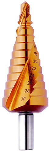 HSS trappenboren met een gespiraliseerde spaangroef. Verder beschikken de trappenboren over een ontbraam-kantenbreker en een RotaStop schacht. TiN Coating